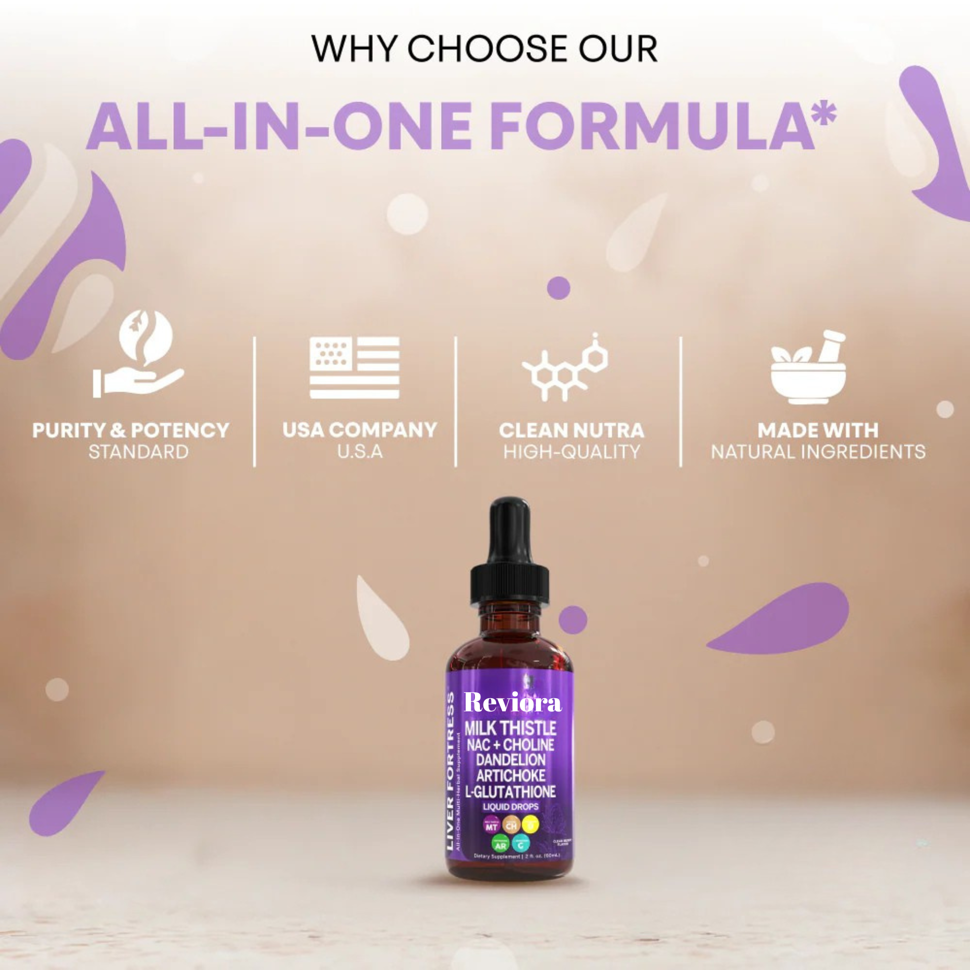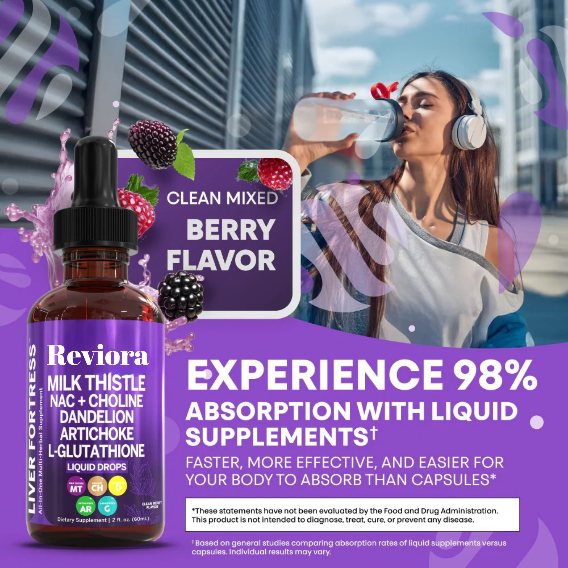 Reviora Liver Fortress is a premium liquid liver health formula made with herbs and nutrients traditionally used to support healthy liver function, gentle detox pathways, and antioxidant protection.*